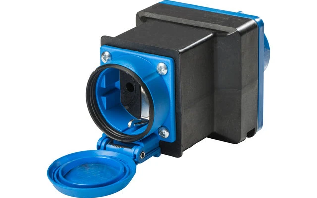 Festes Adapterstück CEE-Stecker auf Schutzkontakt-Steckdose mit Klappdeckel
