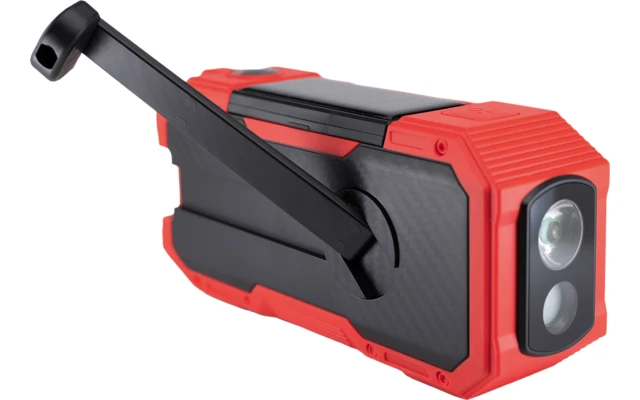 - Vielfältige Energiequellen: integrierter Akku, Handkurbel, USB oder Solarmodul