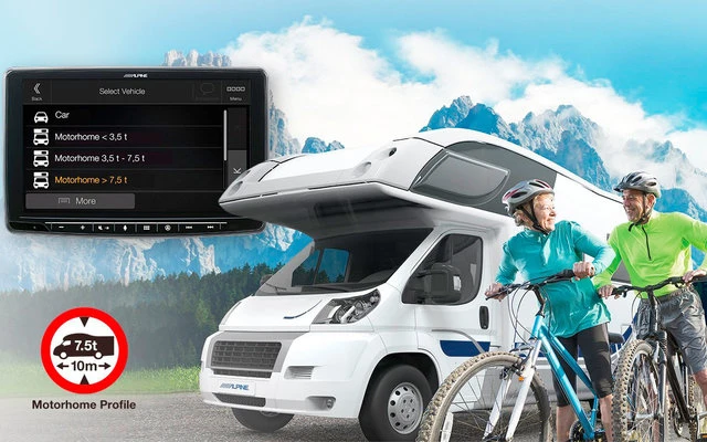 Sie können zwischen 3 verschiedenen Reisemobilprofilen wählen (kleines, mittleres oder großes Reisemobil) oder ein eigenes Profil erstellen. Das Alpine System berücksichtigt die Abmessungen und das Gewicht Ihres Fahrzeugs und schlägt nur Routen vor, die für Ihr Fahrzeug geeignet sind.