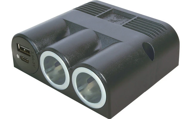 Input 8-34 V DC, E1 Zulassung, Eigenverbrauch ≤ 1 mA. Anschluss: 1x USB-C und 1 x USB-A Überlastschutz, Übertemperaturschutz, Verpolungsschutz, Kurzschlussschutz, Überspannungsschutz bei kurzen Spannungsspitzen 2 Powersteckdosen 12-24 Volt (Innen Ø 21 mm) zum Betreiben von Geräten, die mit 12-24 Volt betrieben werden dürfen. Belastbarkeit max. 20 A bei einem Zuleitungsquerschnitt von 2,5 mm2, max. 16 A bei einem Zuleitungsquerschnitt von 1,5 mm2. Befestigung mittels beiliegender Schrauben. Kabelanschluss vorkonfektioniert