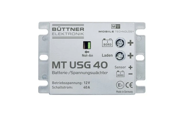 Wird zwischen Batterie und die 12 V-Verbraucher geschaltet. Schützt Batterie sowie Verbraucher vor schädlicher Unterspannung (Verbraucher AUS bei 10,7 V) und die angeschlossenen Verbraucher vor schädlicher Überspannung (AUS bei 15,5 V). Über einen separaten Schaltausgang ist der MT USG 40 fernbedienbar und somit auch als Hauptschalter (alle Verbraucher AUS/EIN) zu verwenden.