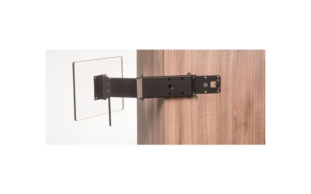 Kompakter Halter CFW305S aus Stahl, schwarz lackiert, mit drei Drehpunkten und sehr großem Schwenkbereich. Bei vielen Fahrzeugen so einsetzbar, dass sich das TV-Gerät von der Sitzgruppe und vom Bett aus betrachten lässt. Verriegelbar, damit sich das TV-Gerät während der Fahrt nicht bewegt. An der Ober- und Unterseite des CFW305S sind Ösen zur Leitungsführung angebracht.