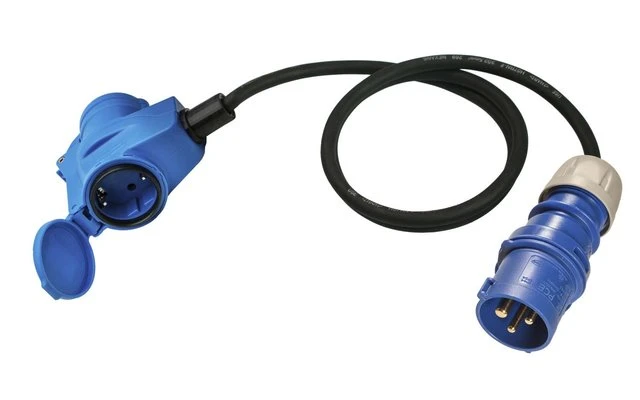 - CEE-Stecker 230 V / 16 A, 3-polig und CEE-Winkelkupplung 230 V / 16 A, 3-polig mit integrierter Schutzkontaktsteckdose 230 V / 16 A mit Klappdeckel