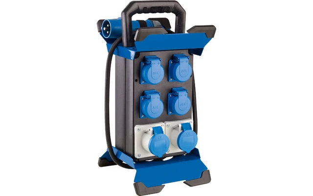 CEE-Stromverteiler mit großem handlichem Tragegriff. Standsicheres Metallgestell mit Kantenschutz.