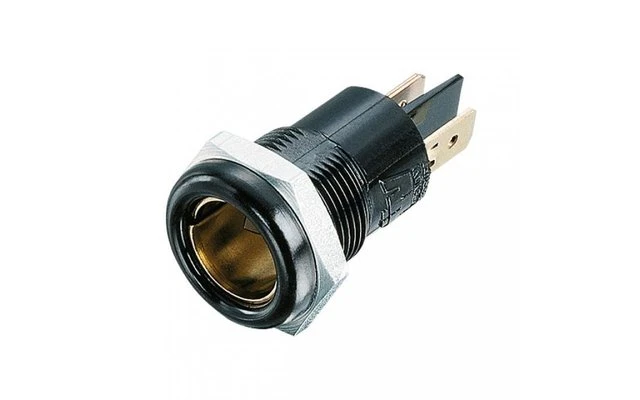Mit Flachsteckeranschluss 6,3mm. Befestigung mittels Sechskantmutter, passend für Norm- und Universalstecker, Innen-Ø 12mm, max. 16 A/ 12-24V