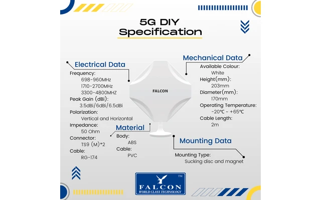Mit der tragbare DIY 5G/LTE-Lösung für Wohnwagen- und Wohnmobil können Sie Internet genießen und das ohne auf ein kostenpflichtiges WLAN eines Campingplatzes angewiesen zu sein. Dank des mitgelieferten Saugnapf und Standfuß, sind Sie bei der Positionierung der Falcon DIY Antenne extrem flexibel.