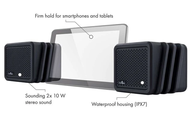 - Haltevorrichtung zwischen den beiden Lautsprechern zum Aufstellen von Smartphones und Tablets