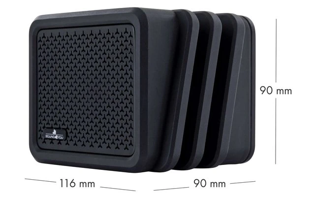 - Zwei Lautsprecher können zusammen oder einzeln genutzt werden (mit praktischen Trageband)