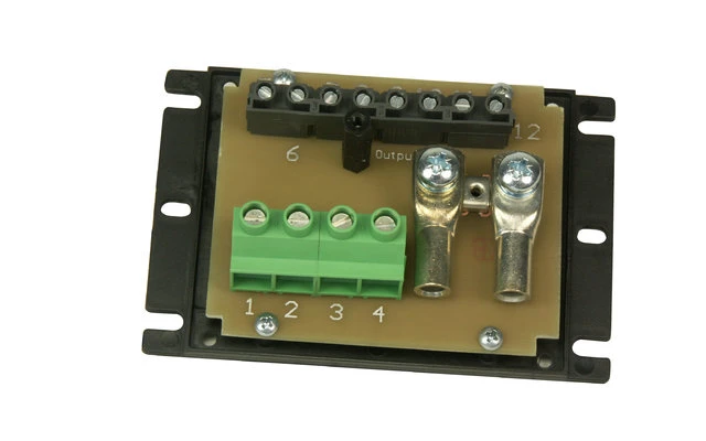 - Ein weiterer Schraubblock dient bei Bedarf zur weiteren Minus-Durchgangsverteilung (Kabelschuh 16 mm²). Verteilt wird auf 4 Klemmen (6 mm², max. 32 A) sowie 8 Klemmen (4 mm², max. 20 A).