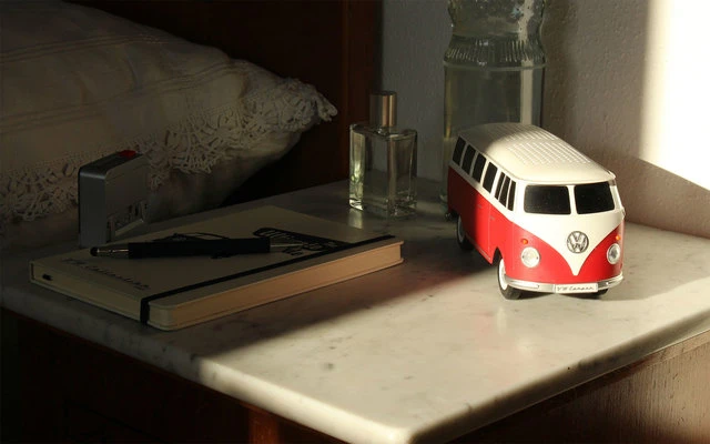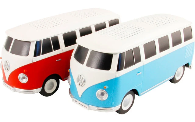 Der Lautsprecher hat die Form des VW Bulli T1 in dem legendären rot-weiß. In der Lieferung enthalten ist ein USB-Ladekabel. Verpackt ist der Bluetooth Speaker in einer schönen Geschenkverpackung.