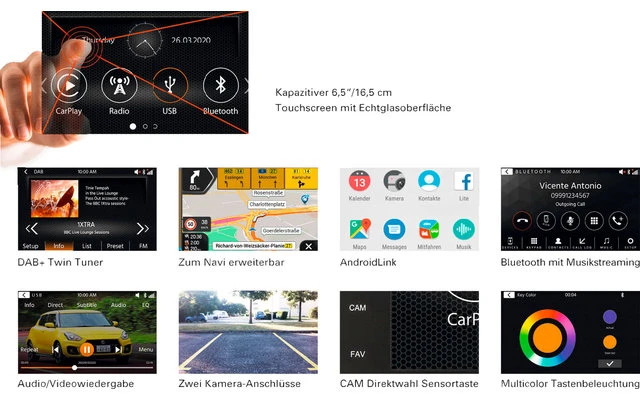 - Kapazitiver, berührungsempfindlicher 16,5 cm / 6,5“ Echtglas-Bildschirm (800 x 480 Pixel)